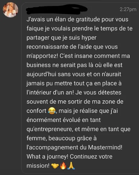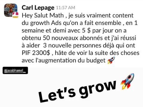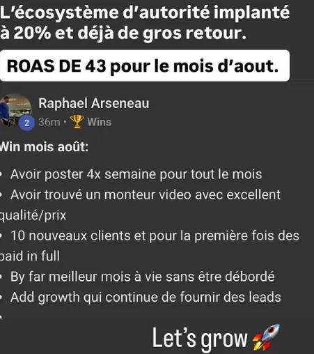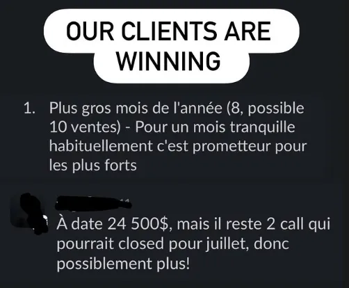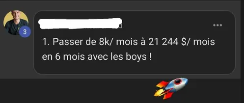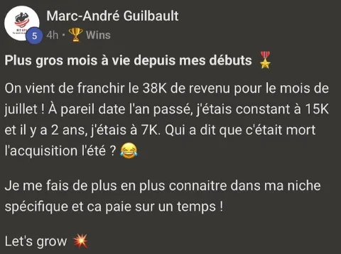 Les chiffres de ventes mentionnés dans ce funnel sont des résultats individuels en termes de ventes et de marketing. Veuillez comprendre que ces chiffres ne sont pas typiques, et nous ne garantissons en aucun cas que vous obtiendrez les mêmes résultats. Les résultats marketing rapportés ici sont typiques pour les clients qui répondent à nos critères. Nous avons plus de 5 ans d’expérience en marketing et avons une communauté établie en conséquence. La plupart des personnes qui suivent des instructions ou formations de type "comment faire" obtiennent peu ou pas de résultats. Ces références sont uniquement fournies à titre d’exemple. Les résultats en termes de ventes varient et dépendent de nombreux facteurs, notamment, mais sans s’y limiter, l’expérience, les antécédents et l’éthique de travail. Toute entreprise implique des risques ainsi qu’un effort massif et constant. Si vous n’êtes pas prêt à accepter cela, ce programme n’est pas pour vous.